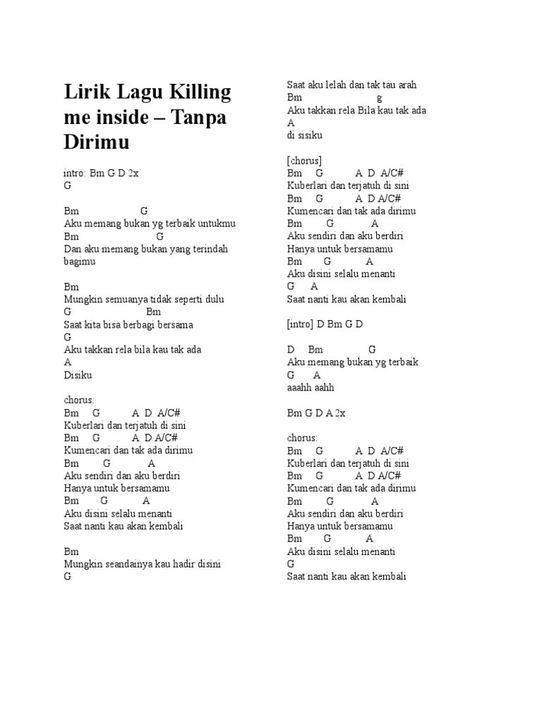 Kau inginku menjadi yang terbaik bagimu. Aku memang bukan yang terbaik untukmu / dan aku memang bukan yang terindah bagimu / mungkin semuanya tak seperti dulu . Kau inginku menjadi yang terbaik bagimu. Kau inginku menjadi yang terbaik bagimu patuhi perintahmu jauhkan godaan. Sayunya hati pedih jiwa ini. Yang mungkin ku lakukan dalam waktu ku beranjak dewasa G em aku menyesal telah membuatmu menangis am d dan biarkan memilih yang lain c bm em tapi . Yang mungkin ku lakukan dalam waktu ku beranjak dewasa Yang terbaik bagimu, patuhi perintahtahmu, jauhkan godaan, yang mungkin ku lakukan, . Lepaskan ku jika benar engkau tidak mahu. Sakitnya hatiku tiada siapa yang tahu Berikut ini lirik lagu 'setengah hati' yang dipopulerkan leh grup band ada band yang dirilis pada tahun 2004 silam.